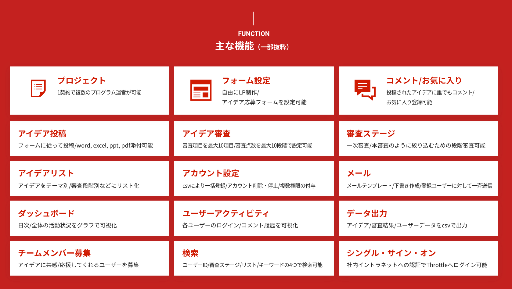 Throttleは、「インキュベーションの民主化」をコンセプトにすべての挑戦者の新規事業創出を支援することを目指し、新規事業創出プログラムや社内ベンチャー制度、オープンイノベーションやアクセラレーションプログラム等を含む、あらゆるイノベーション創出活動に最適化された国内初にして国内シェアNo.1のSaaS型イノベーションマネジメント・プラットフォームです。今後の日本企業においてイノベーション・マネジメントの概念や手法が普及し、新規事業創出への取り組みを試みる企業が増加していくと想定される中、新規事業開発やオープンイノベーションにおけるアイデア創出から事業化に至るまでの一連のプロセスを一元的に管理・運用できる仕組みとテクノロジーを提供することで、挑戦する企業や組織の支援を行うことを目的に2019年8月より提供を開始しました。2020年12月時点で、既に導入企業社数で1,350社・利用者数で3.5万人以上のユーザーにご利用いただいている実績があります。