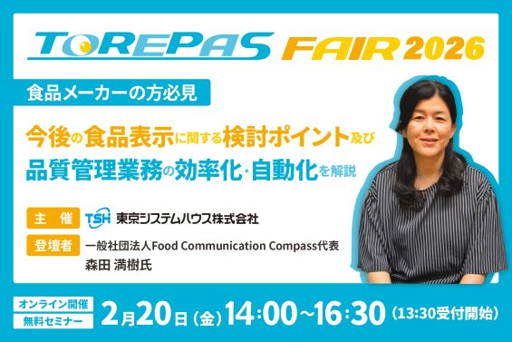 ITサービスの提供を行う東京システムハウス株式会社(本社:東京都品川区、代表取締役:林知之、以下「当社」)は、食品メーカー向けに、今後の食品表示に関する検討ポイントおよび、品質管理業務の効率化・自動化を解説するオンラインセミナーを2026年2月20日(金)14:00~16:30に開催します。