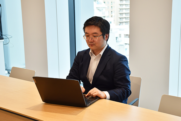 研究開発サポート部では、ICT分野で研究開発を進めるお客様に対し、システムやアプリの受託開発、エンジニアの常駐派遣といったサービスを提供しています。私は課長として、受託開発チーム、常駐派遣チーム、営業チームの3つのグループを統括しています。各グループの進捗状況を把握しながら、プロジェクトが円滑に進むよう調整やサポートを行うことが主な役割です。また、営業グループとも連携し、技術的なヒアリングや提案が必要な場面では、お客様との打ち合わせに同行することもあります。取引先の拡大に向けて、開発と営業の両面から取り組んでいます。