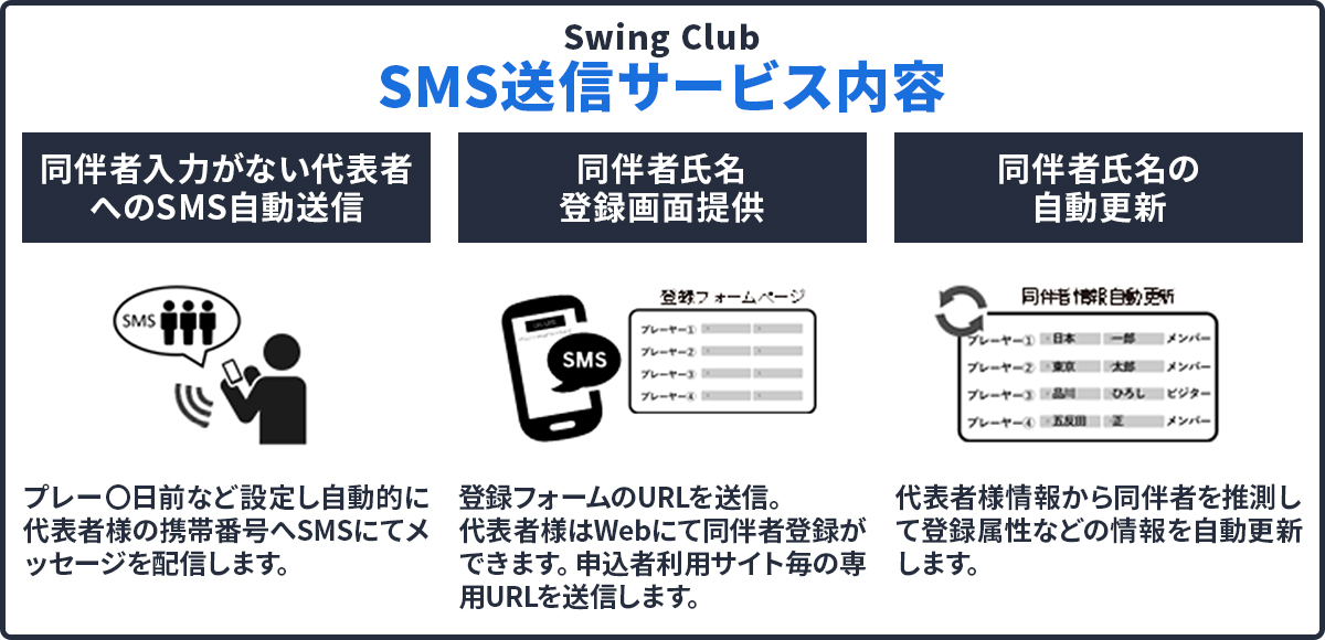 【新オプション】SMS送信サービス発売 2026.02.03SwingClub新オプション機能誕生 【新オプション】SMS送信サービスとは プレー予約が入っているお客様で同伴者の氏名をいただけていない代表者の携帯電話にSMSで組合せ依頼の案内を自動配信するサービスです。 SwingClubの予約画面から自動取り込みを行い、お客様のスマホにメッセージと同伴者入力画面のURLが着信される仕組みのため ✅ 電話をかける時間削減 ✅ 電話料金削減 ✅ 従業員の精神的負担軽減 などのメリットがあります。